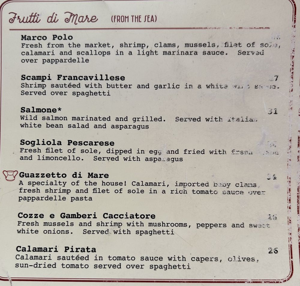 A specialty of the house! Calamari, imported baby clams, fresh shrimp and filet of sole in a rich tomato sauce over pappardelle pasta